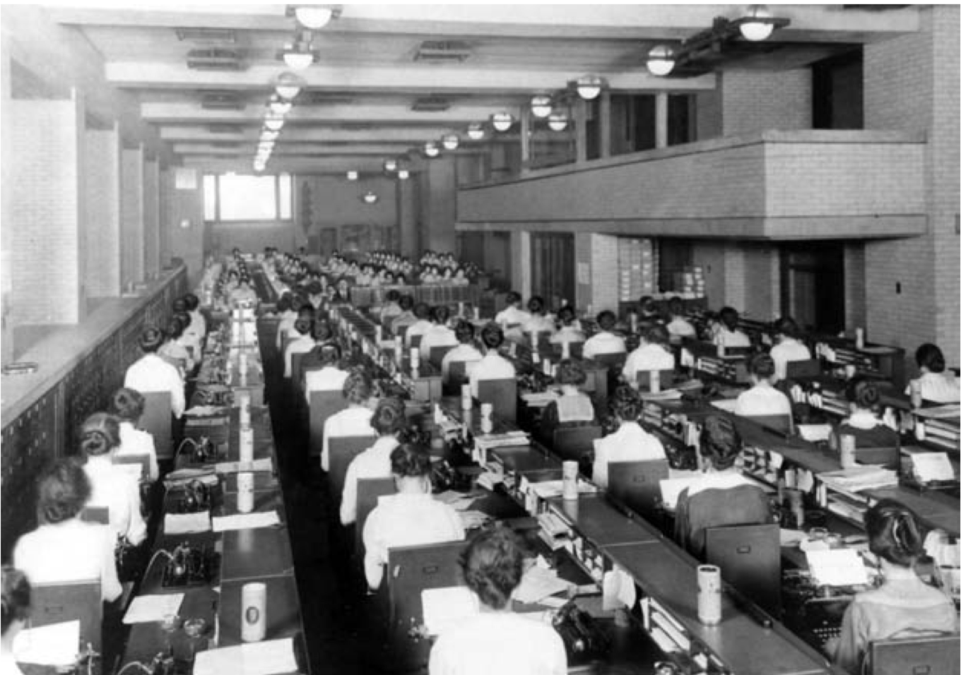 This office design trend continued into the 1920s before becoming obsolete by the decade's end. Although there are some obvious differences, today's open-plan office shares many of these Taylorist ideals—rows of desks with workers staring at a screen instead of a typewriter.