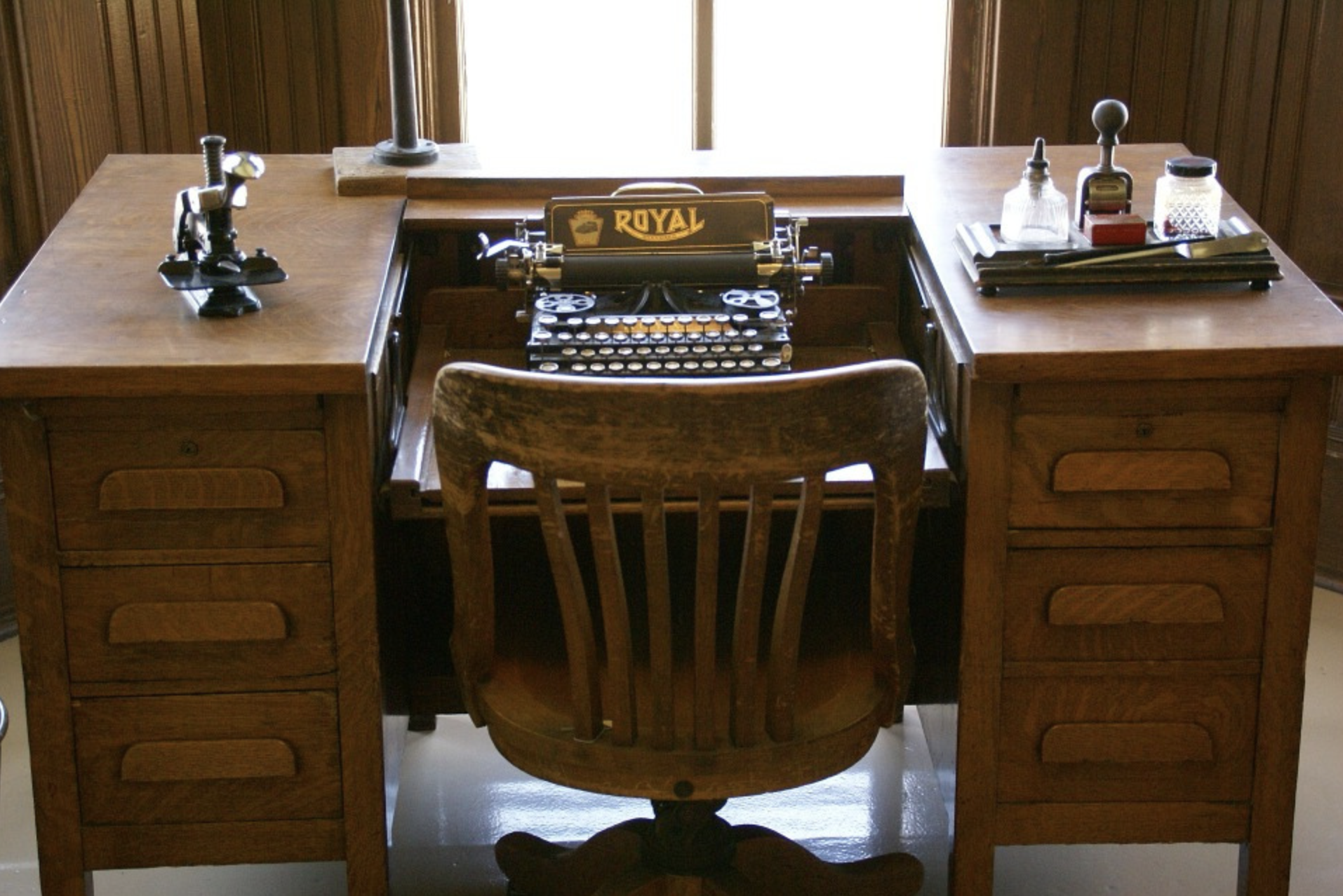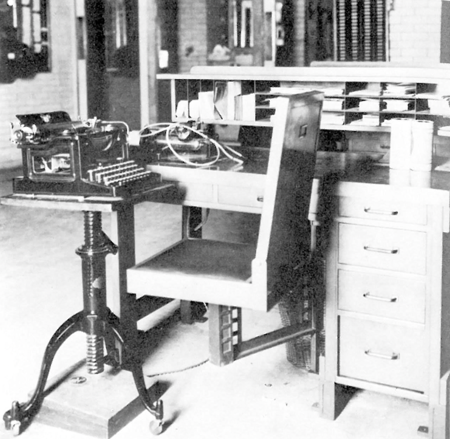 Staring at the photo, I began thinking about the objects in the image and the central focus of the worker: the distinctive typewriter! Sitting at my desk in the same position, I thought I might as well start this brief exploration there.